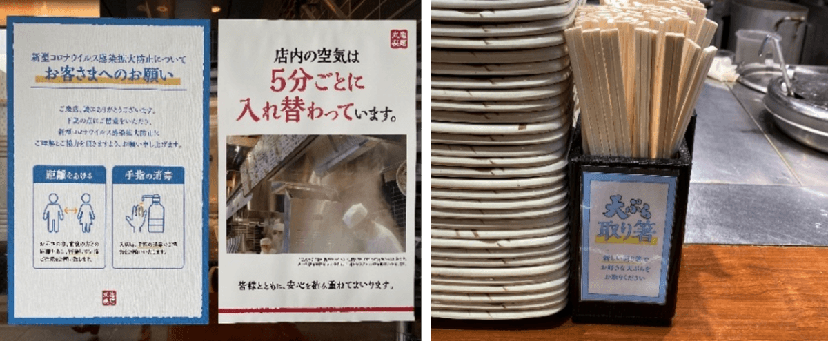 「丸亀製麺」では、①換気、②スタッフの衛生管理、③消毒の設置、④ソーシャルディスタンスの確保、さらには⑤天ぷらを取るための「取り箸」の設置など、きちんと対策がされていて、とっても安心しました。