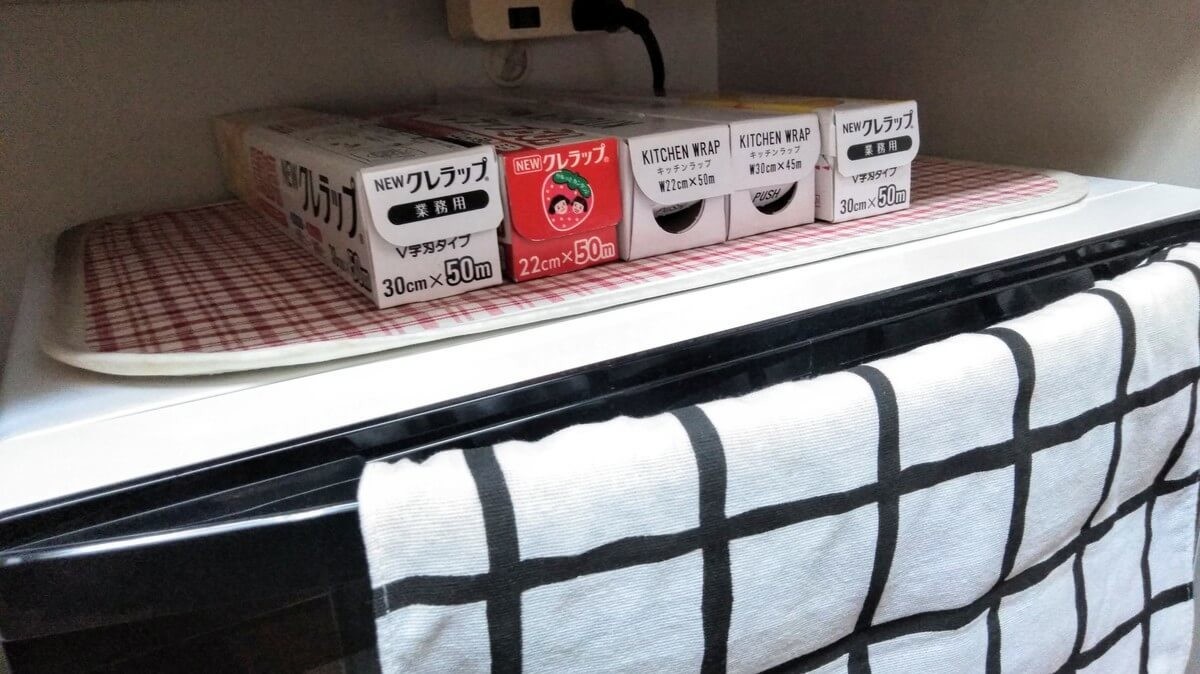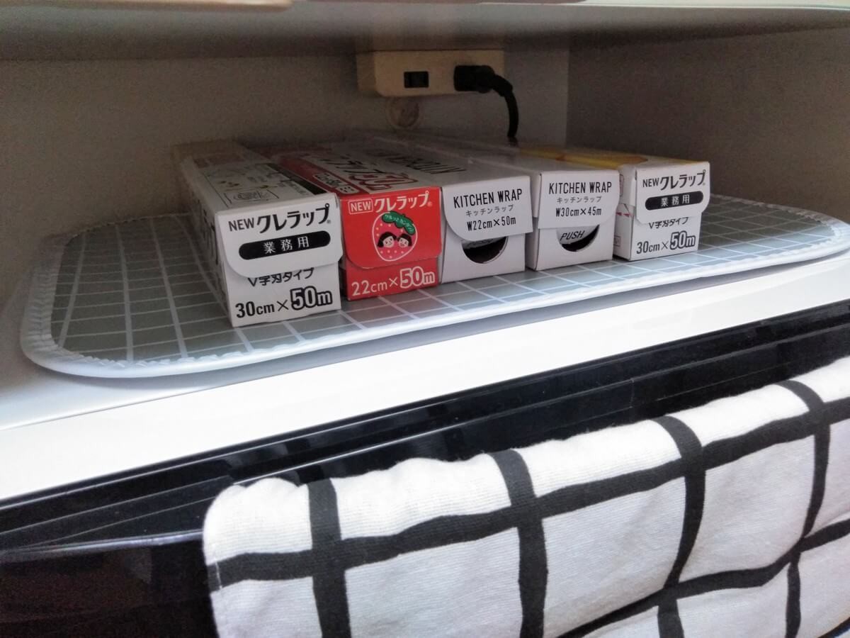 我が家では、レンジ上スペースに、耐熱マットを敷いてラップを置いてますが…