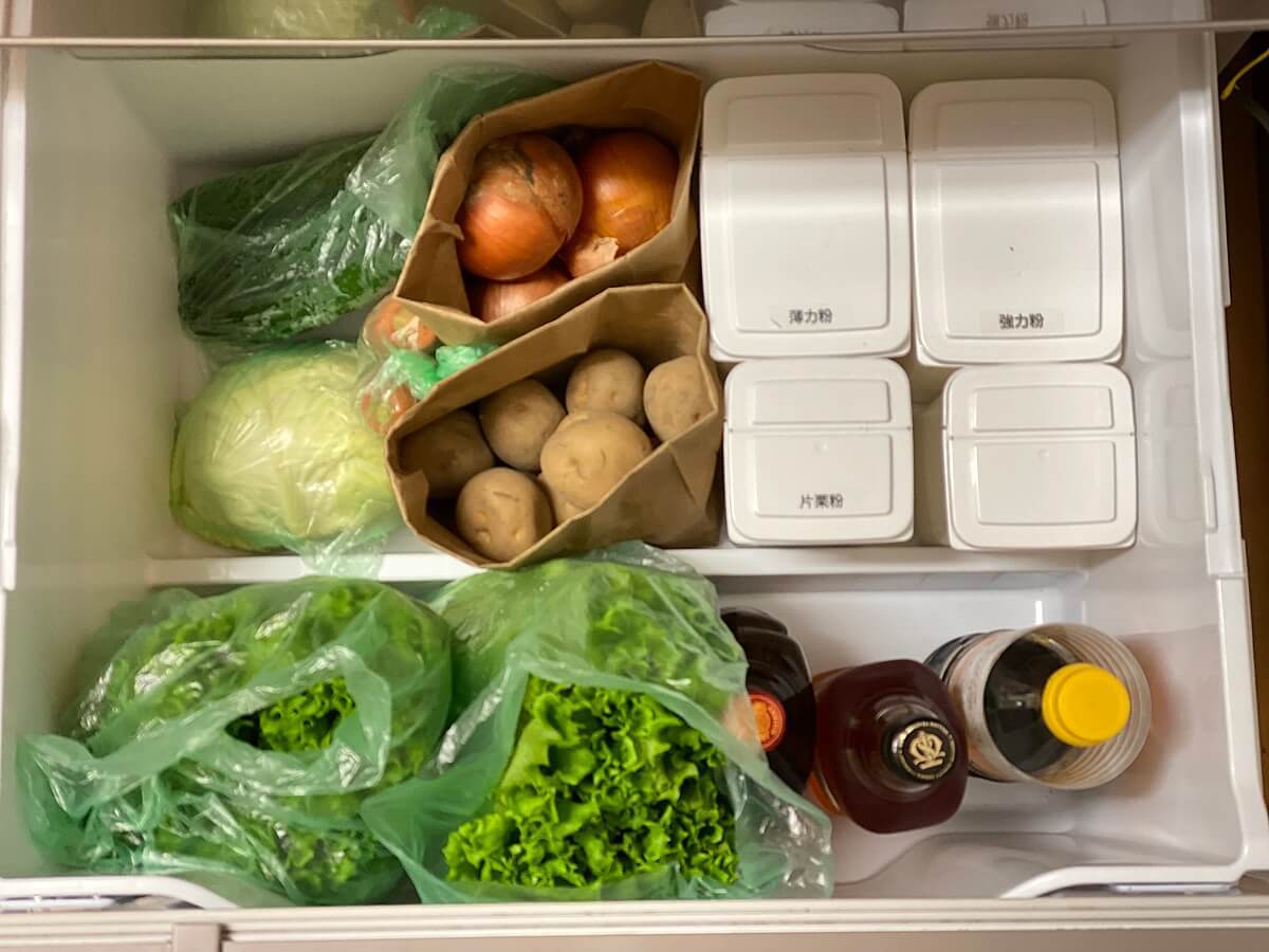 このサイズに入れる大物野菜は限られるので、この枚数でも十分足りています。