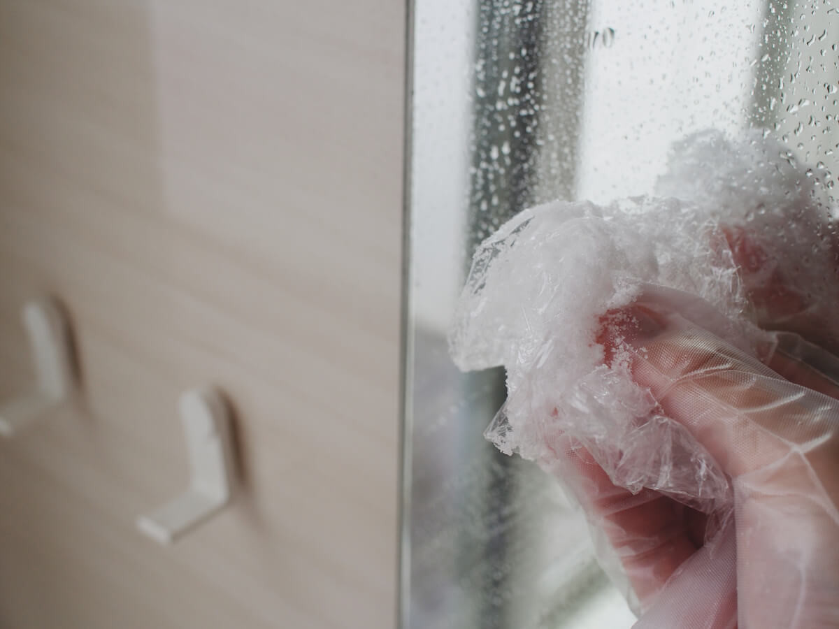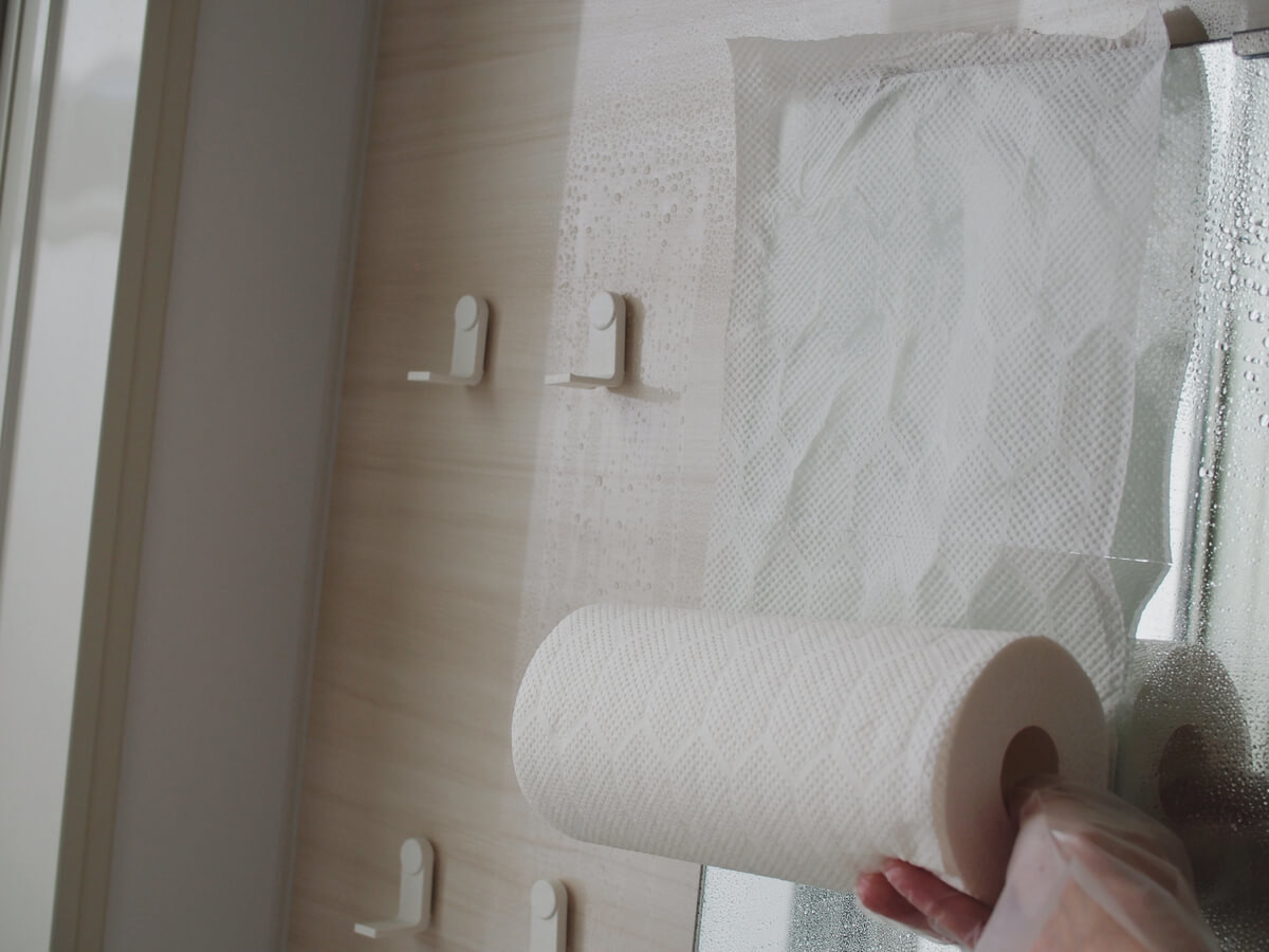 使っていたキッチンペーパーやラップを使って、鏡を磨きます。