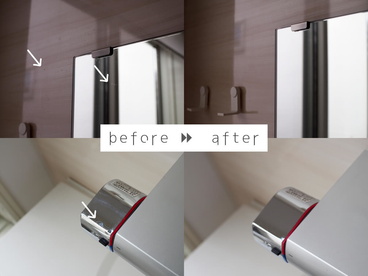 少し分かりにくいですが、拭いても落ちなかった水垢がしっかり落ちました!