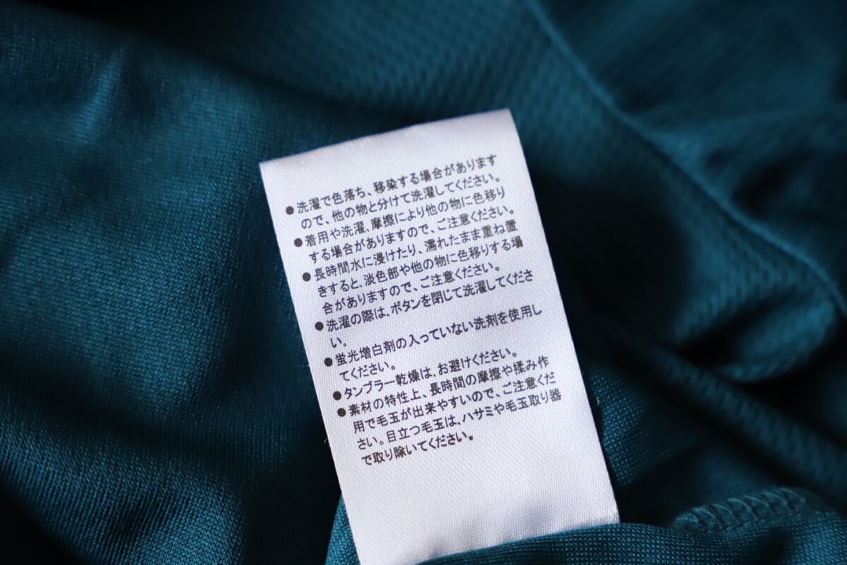 色落ちする可能性があること、タンブラー乾燥は禁止、洗濯の際はボタンは締めること、などがありました。