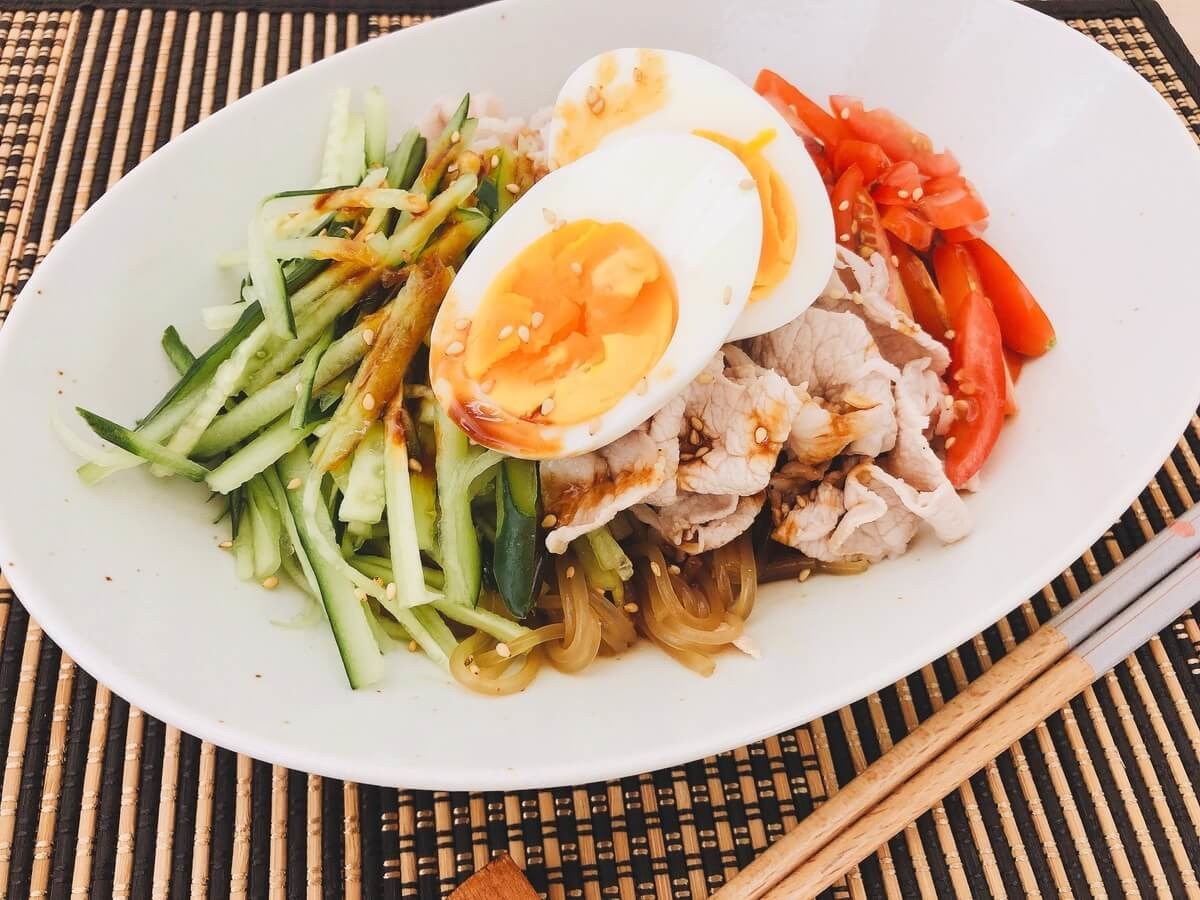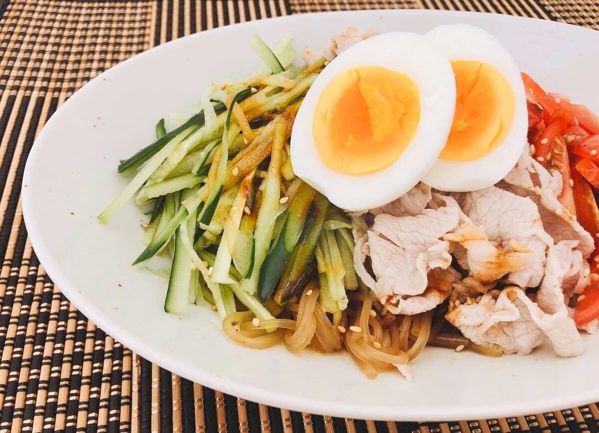 サッパリしているのに食べごたえがあり、結構満足感のある冷麺です。少しピリ辛な味が食欲増進に!トッピングは他にも、サッと茹でたもやしやオクラ、カイワレなどなんでもOK。また、豚肉でなくても鶏肉や牛肉・ハムや焼き豚などでも美味しいですよ。キムチをのせても◎。