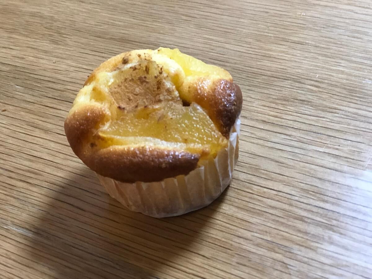 リンゴのコンポートがのった、粉砂糖がかかったマフィンです。コンポートなのに、りんごがとってもシャキシャキいています。時間が経っても温めなおしても、シャキシャキなのには驚きです。