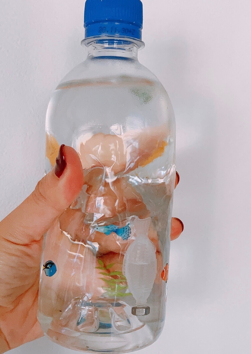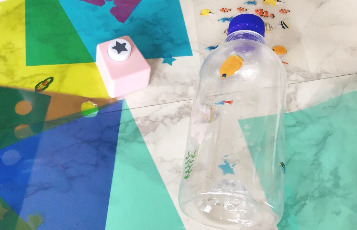 ③ペットボトルにいっぱい水を入れて、魚を浮かべ蓋をすれば完成。