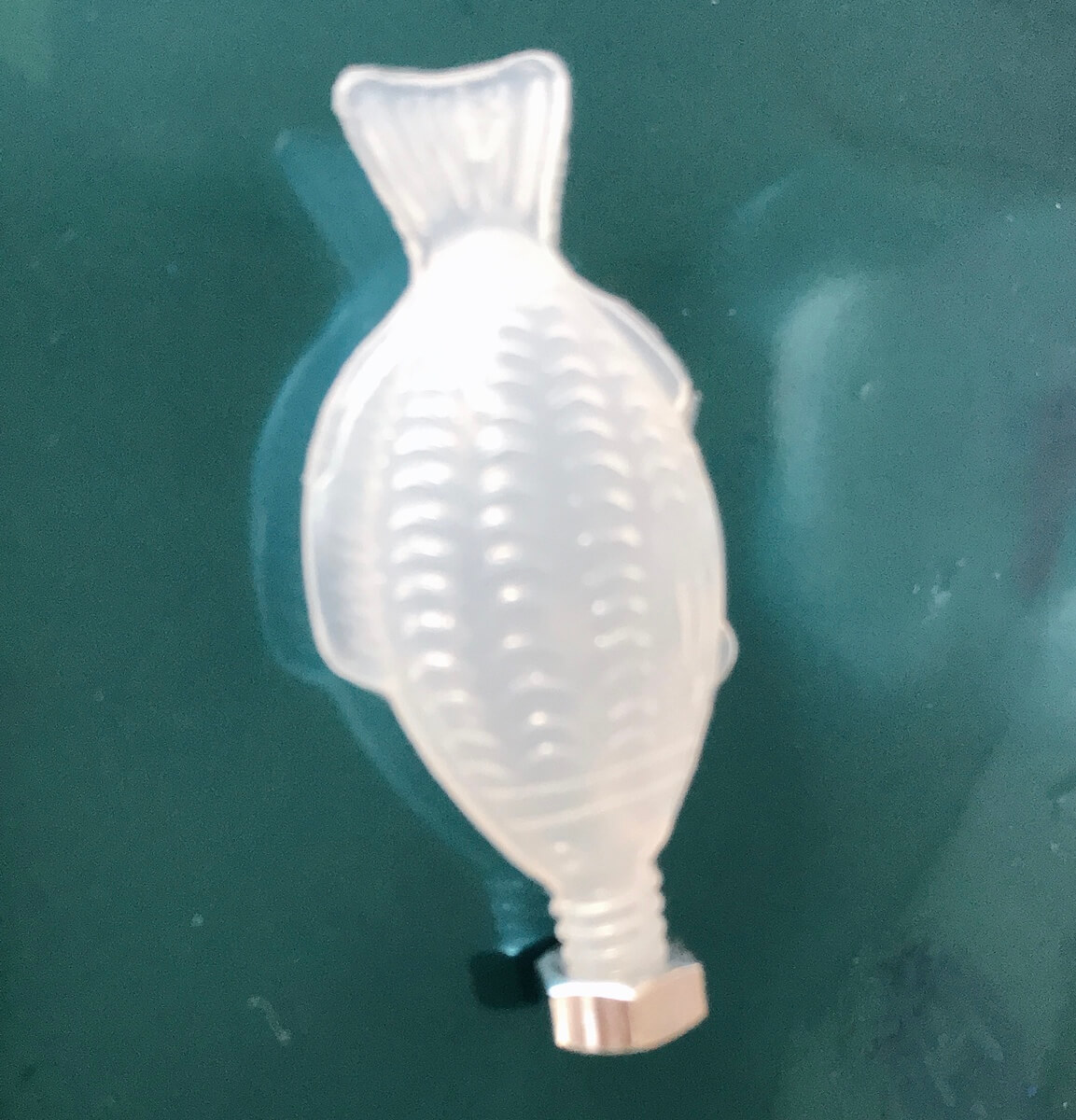 ②魚に水を入れ、それを水に浮かべてちょうど尻尾だけが水面に出るように調整する