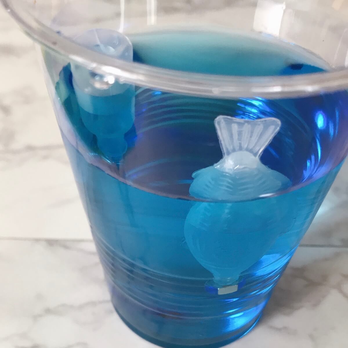 ペットボトルをサイドからギューっと潰して魚が沈めば大成功!沈まない場合は水の量を調整するなどしてくださいね。