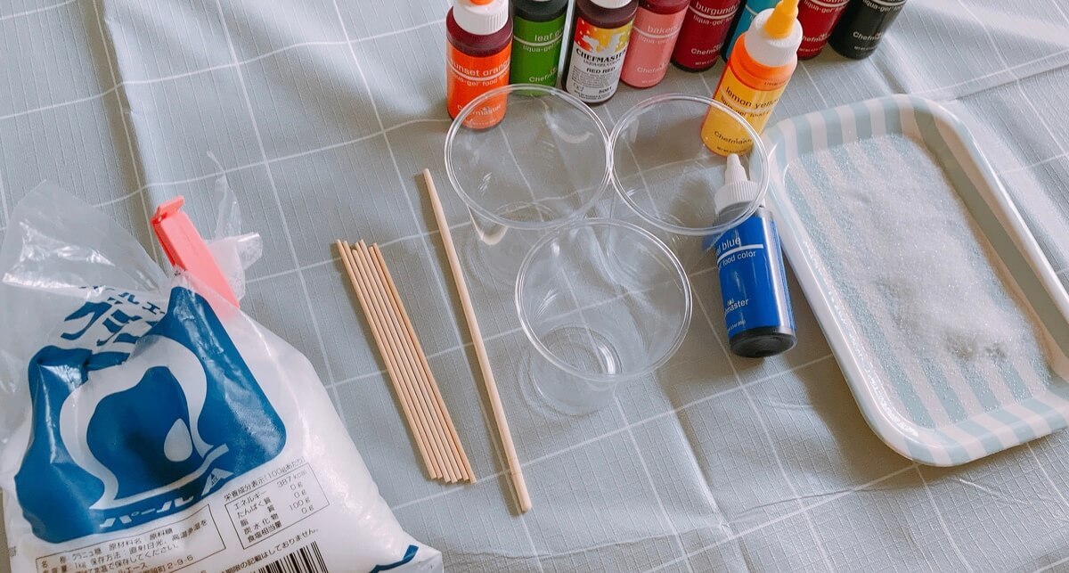 結晶を作る実験には食塩・尿素など色々な物がありますが、今回は子どもでも安全かつ可愛く楽しくできる砂糖の結晶実験をやってみました。