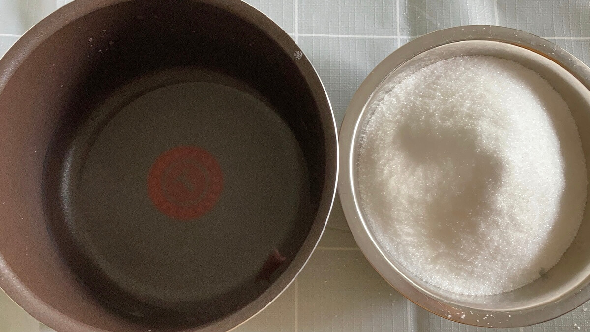 煮詰めないことがポイントです。砂糖が溶けたなと思ったらすぐに火からあげましょう。良く冷まします。砂糖水はすぐには固まりませんので冷ましても大丈夫です。