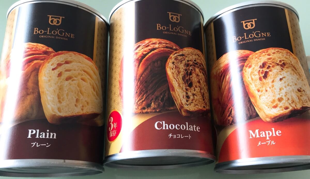 口コミが良かったこのパンの缶詰をネット購入。6缶入で2,480円(税込)なので1缶あたり410円程と割高ではあるのですが、なんと5年の長期保存が可能。味はチョコ、プレーン、メープルの3種類です。