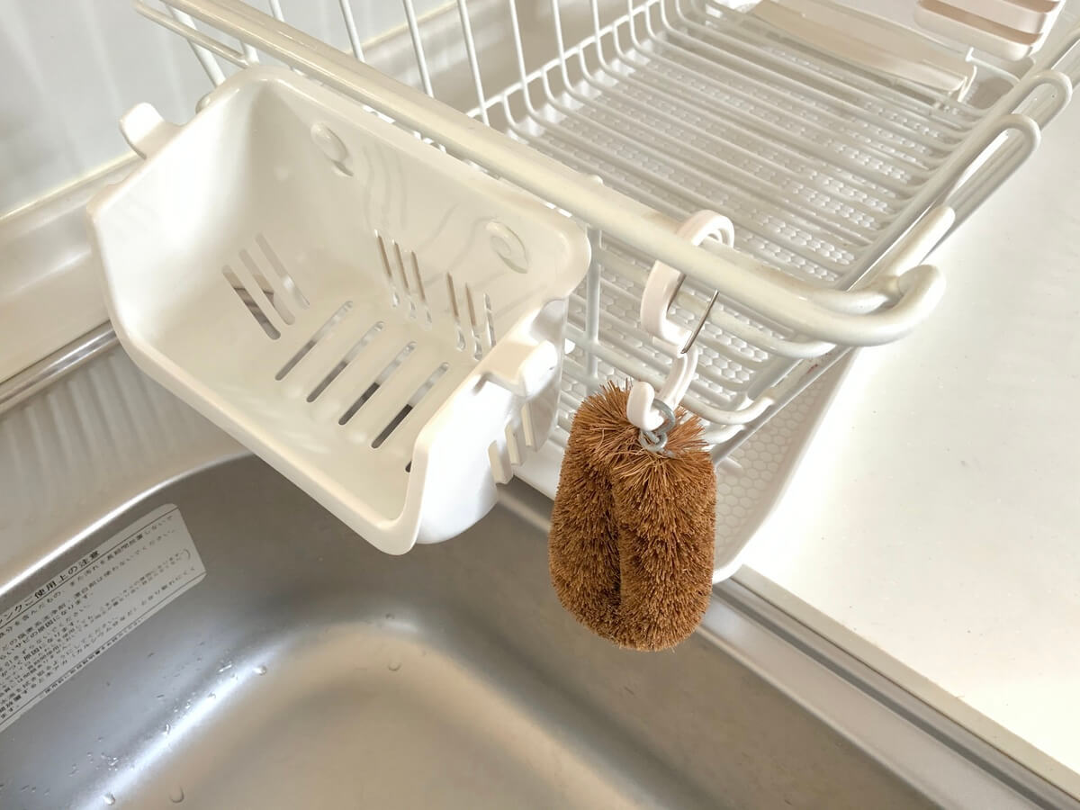 付属のフックが2個ついているので、水切りカゴに引っ掛けて使うことができます。