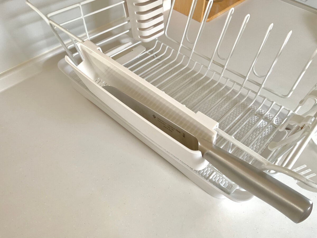 しかし食器洗いの途中だと手が濡れていて水気を拭くことができないし、そのまま食器と一緒に置くのは危ない……。