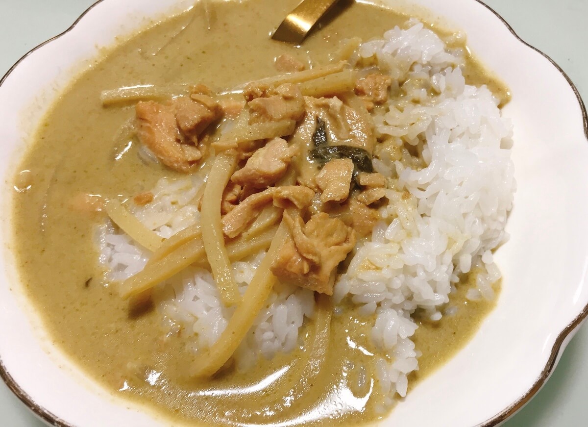 開封してみるとこんな感じです。これは一人前を取り分けた量です。竹の子は歯応えがあっていい感じに仕上がっていますし、鶏肉も十分な量でした。辛さでいうと中辛ぐらいなので中高生の子どもくらいであれば一緒に楽しむことができそうですよ。