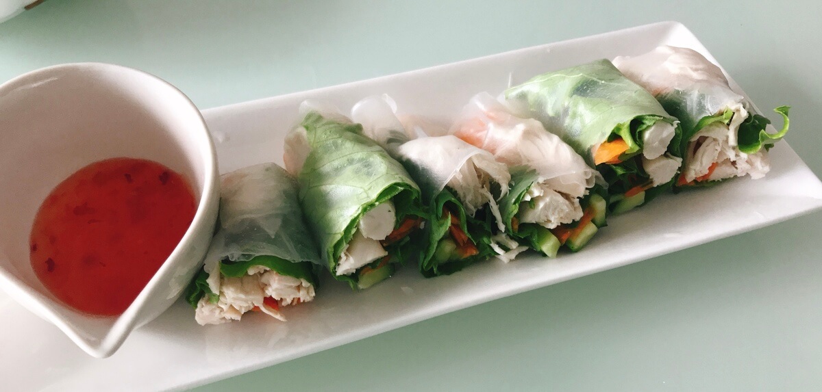 ライスペーパーを満遍なく水で濡らし、そこに好きな具材をのせて巻き巻きすれば完成。あとはスイートチリにディップして食べるだけです。