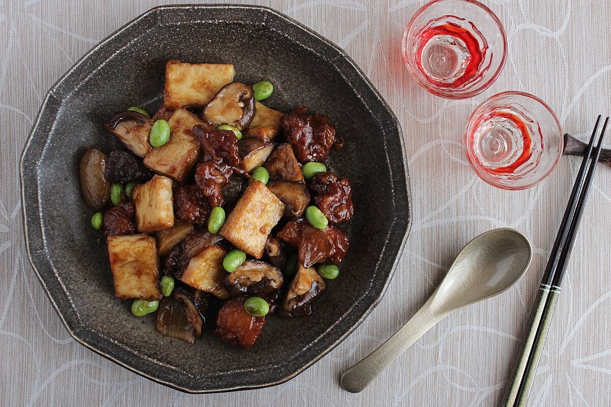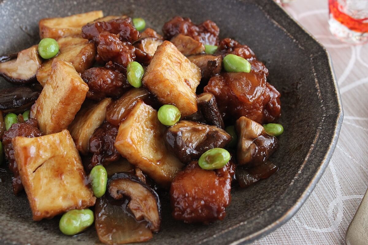 「厚揚げとシイタケ、枝豆の黒酢酢豚」