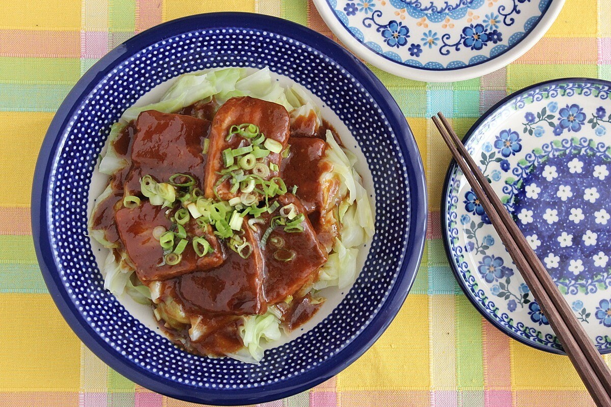 栄養バランスを考え、蒸したキャベツの上にたっぷりのタレごとのせてみました。