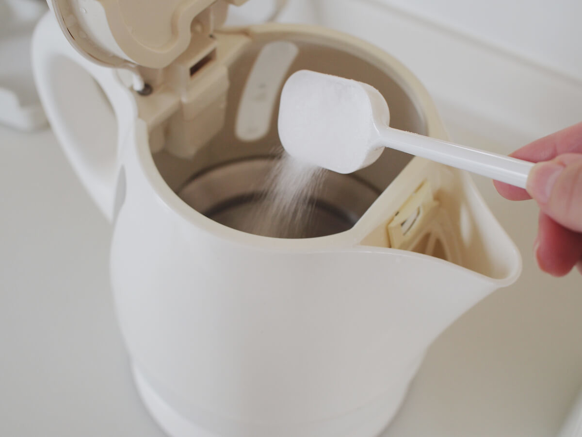 クエン酸の分量の目安は、水1リットルに対して、クエン酸大さじ1〜1.5程度です。電気ポットの取扱説明書に分量が記載されている場合は、従ってくださいね。