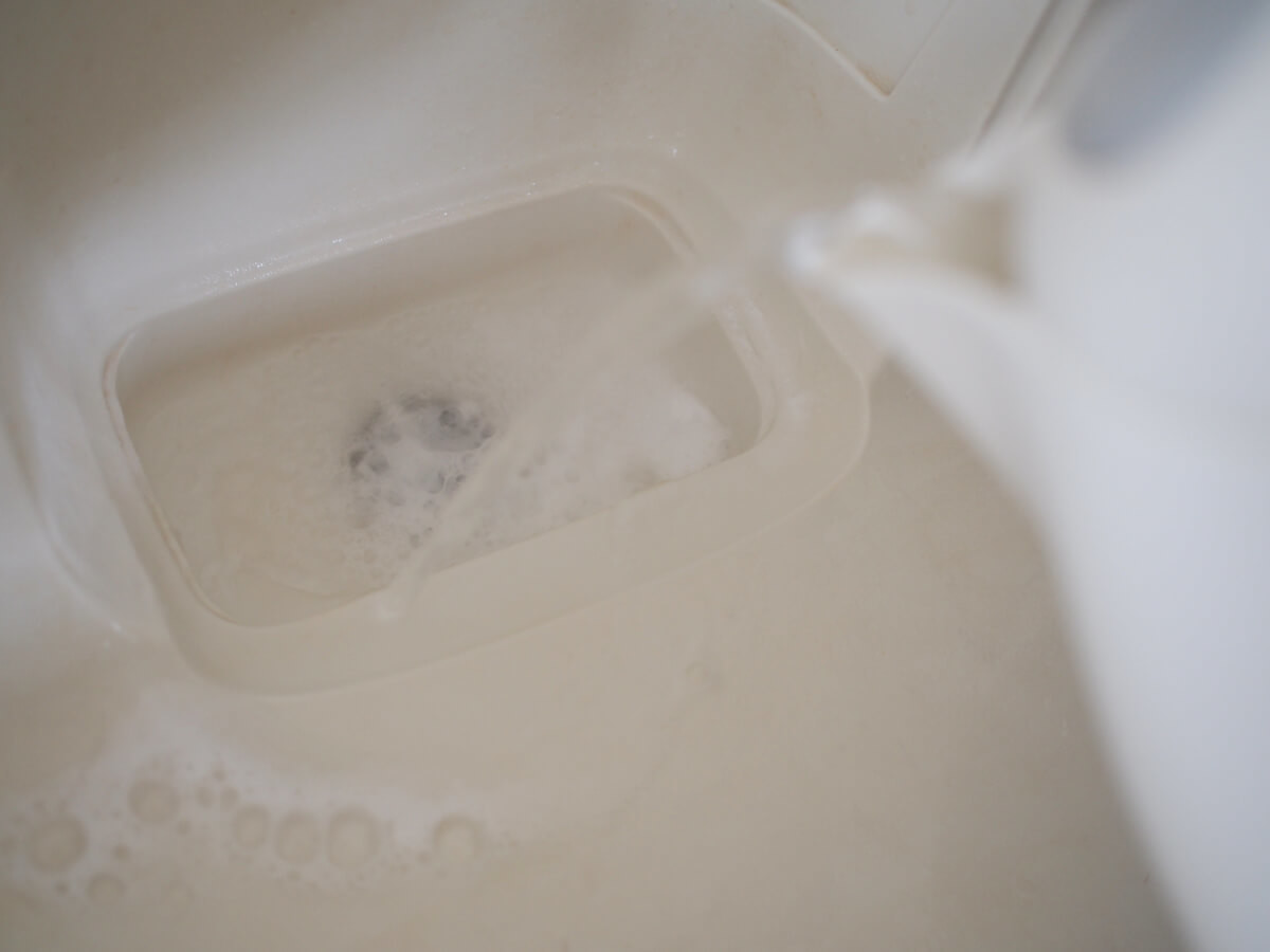30分ほど置いたら、クエン酸洗浄で使ったお湯(60度以下に冷ましてから)をかけます。