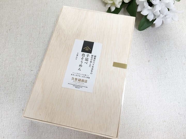 久世福商店の手延べ色そうめんは、高級感のある木箱入りなので手土産や贈り物にもおすすめ。