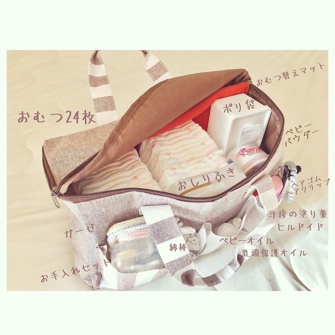 @anstagram81さんはピクニックバッグに紙オムツを24枚もストックしています。余ったスペースにはおしりふきやベビーパウダー・ベビーオイルなどを収納。
