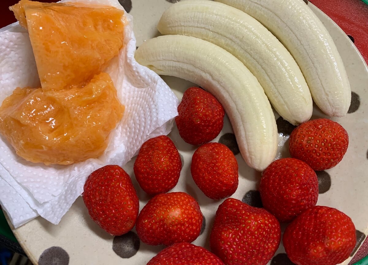 今回はお安いバナナ(レモン果汁を振りかけておきます)、イチゴ、メロンの果肉を使用してメロンケーキを作ります。