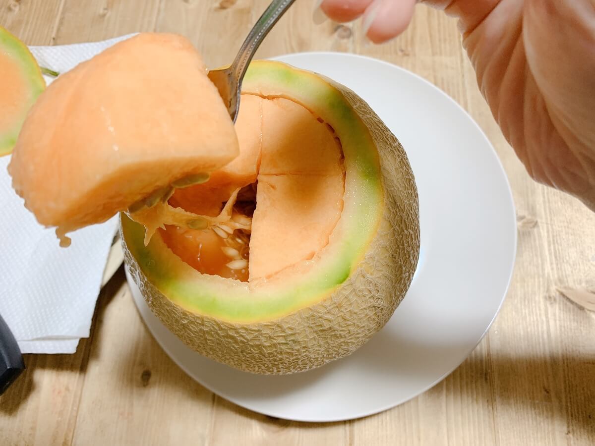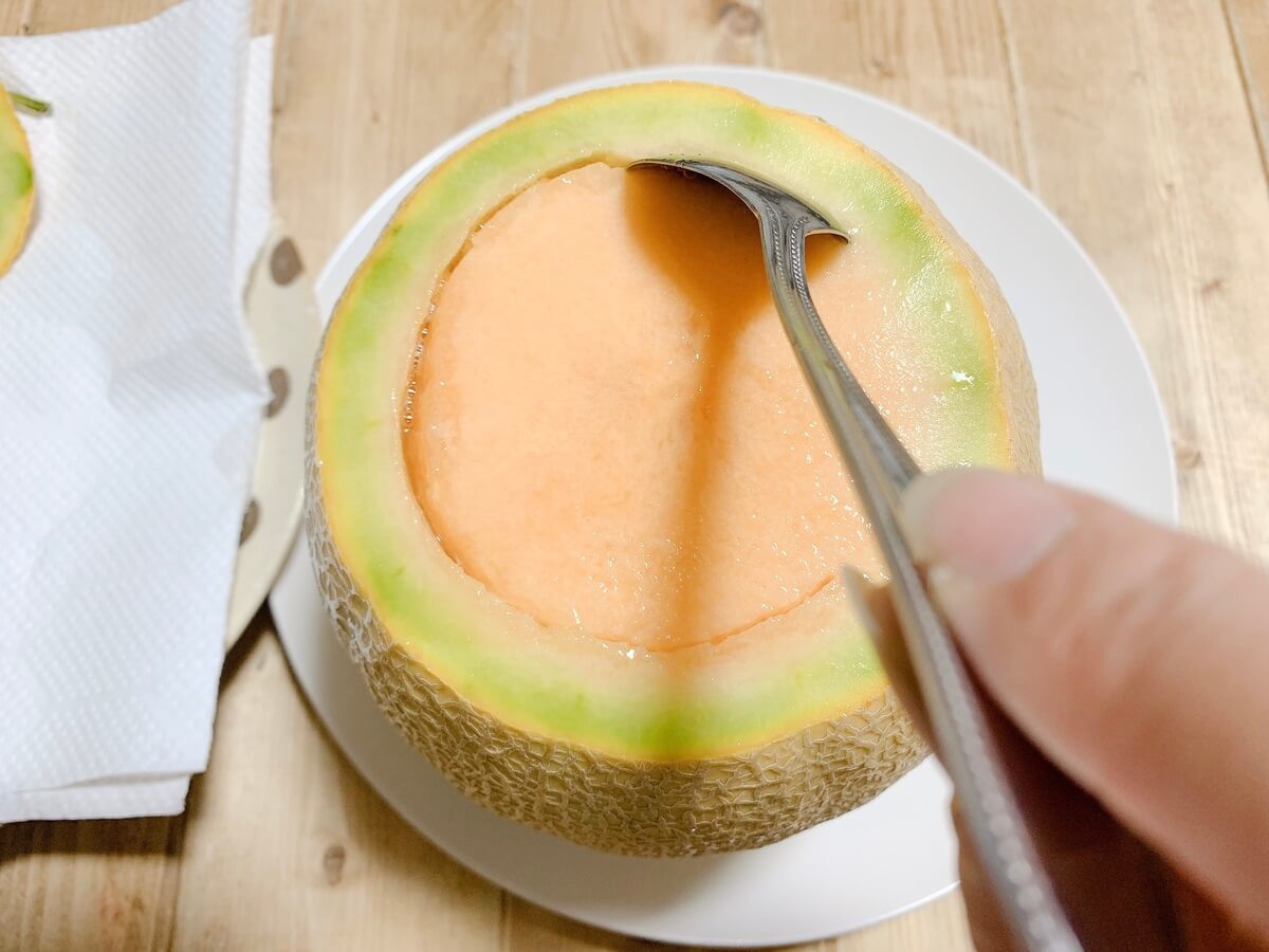 メロンのカーブに沿ってスプーンを一周差し込んでいきます。