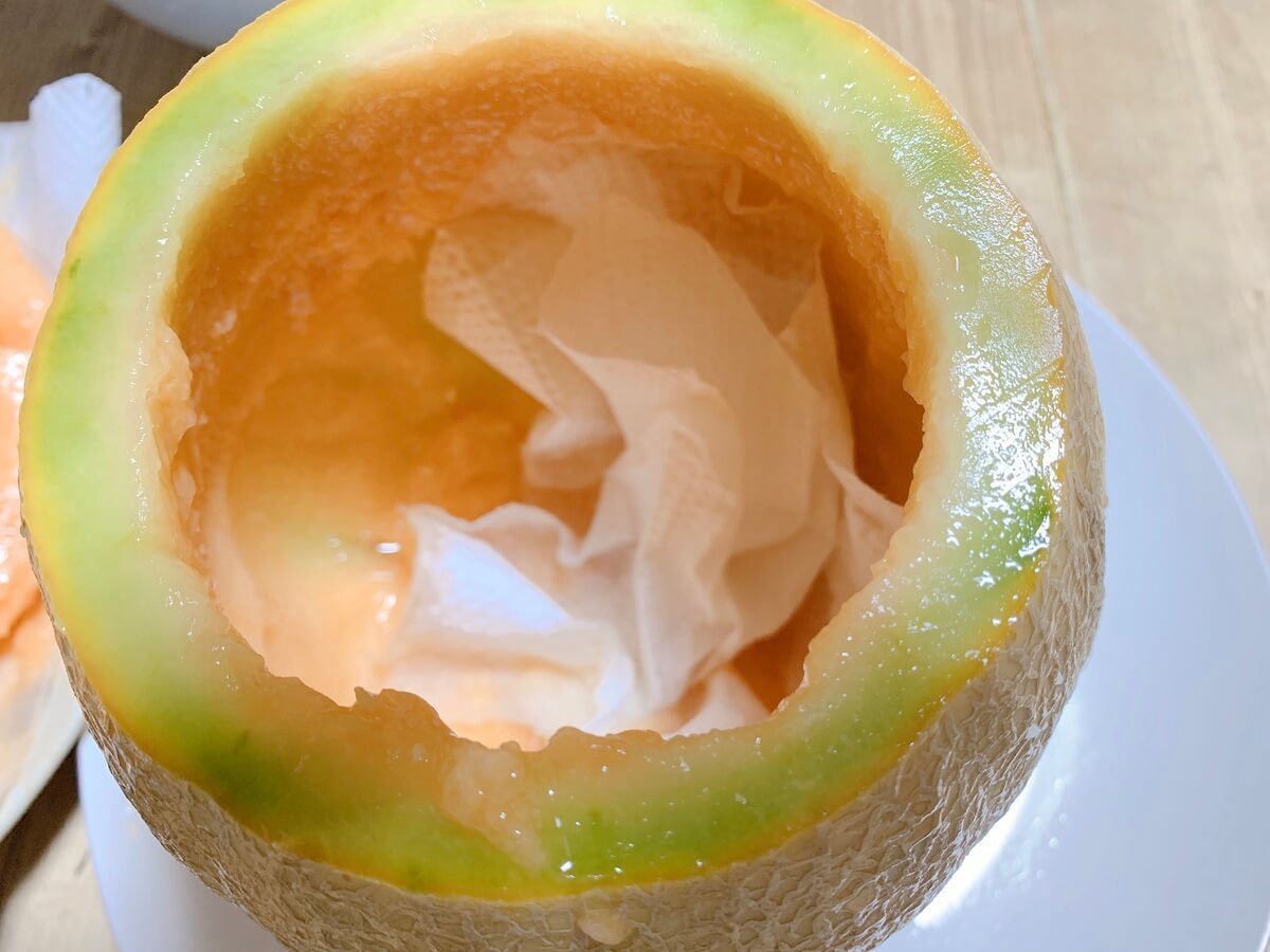 メロンの中にキッチンペーパーを入れて水分を取り除きます。この作業を怠ると出来上がった時、ホイップが溶け出してしまうので必ず行ってください。