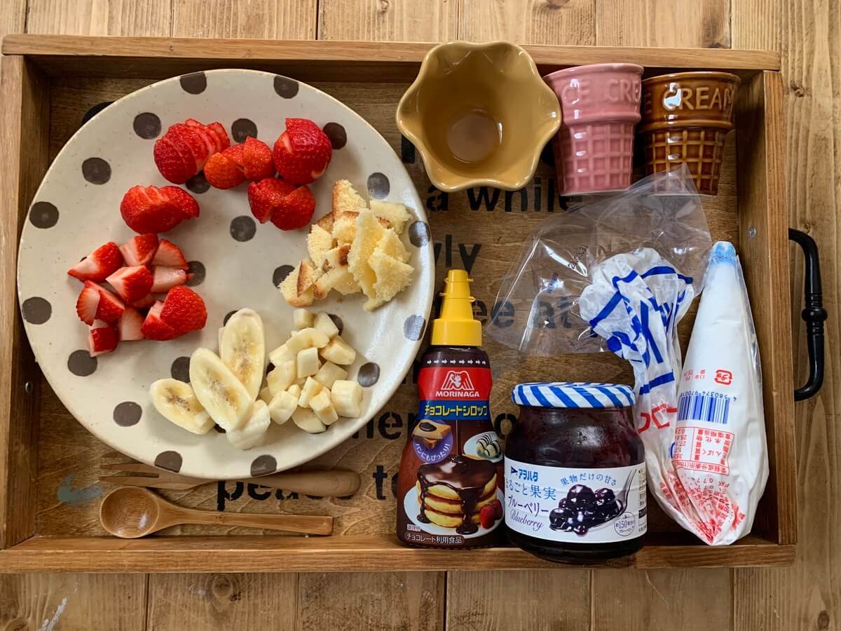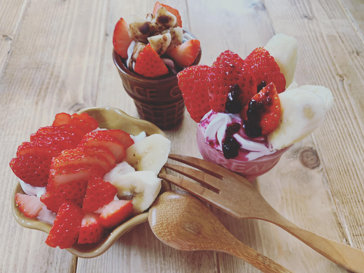 全ての果物は使い切れないので、サイズに合わせて果物をカットし、ミニミニパフェを作りラップして冷蔵庫に入れて置くと、ティータイムや食後にちょっとしたデザートとして頂くことも出来ます。