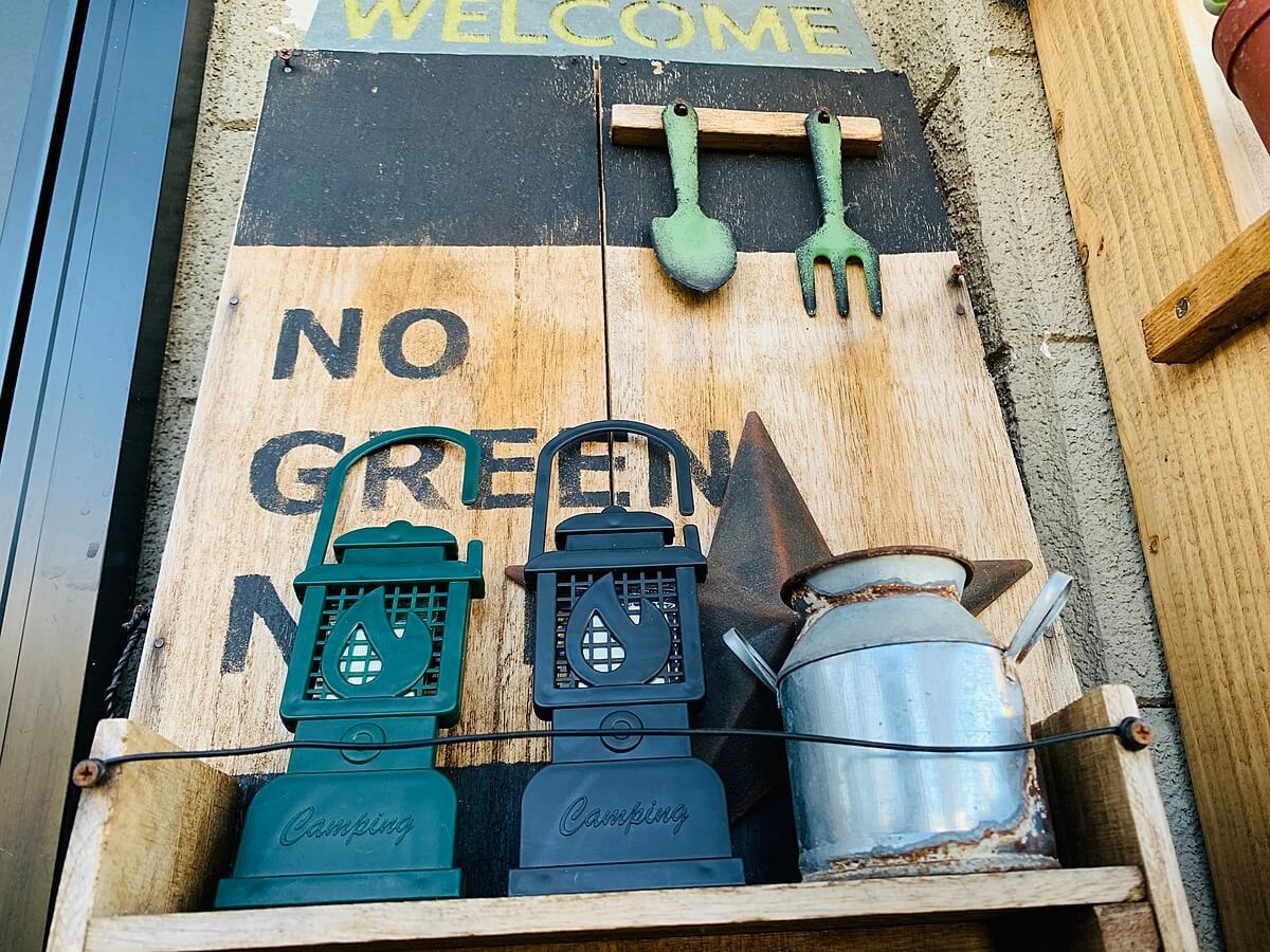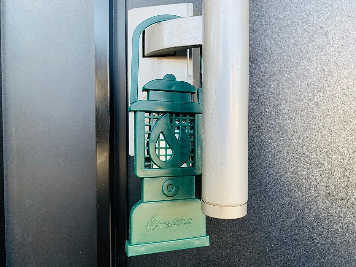 セリアのランタン型「虫よけプレート」は、濡れると中の薬剤が溶け出すかもしれないので、玄関や屋内側の雨や水滴が当たらない場所に設置しました。