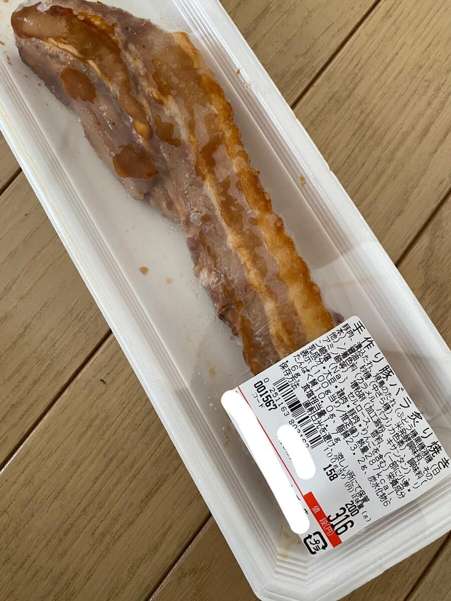 見るからに美味しそうな、手づくり豚バラ炙り焼き! こちらもラ・ムーのお惣菜コーナーにあり、わが家はよく買う定番品です。