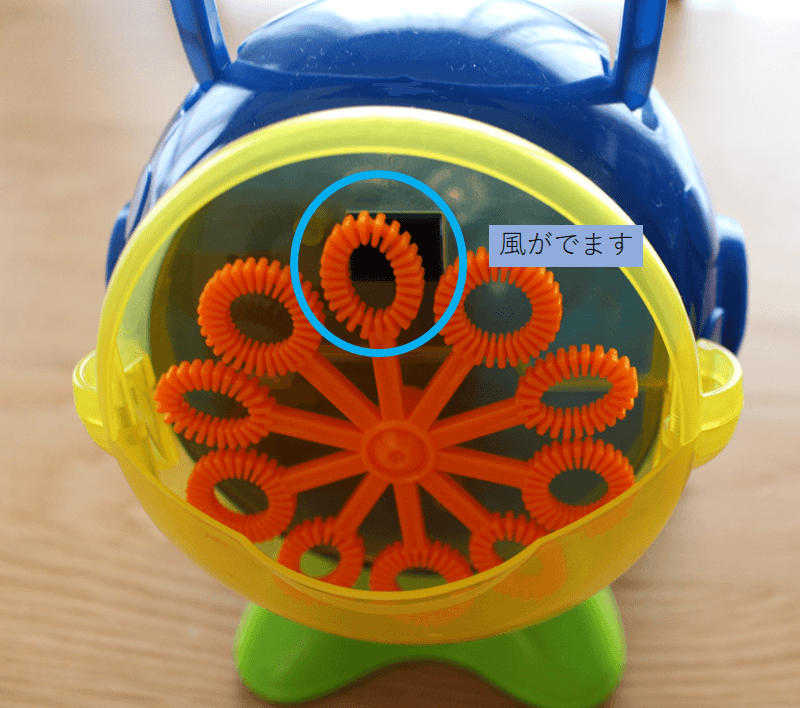 ここから吹き口に風を当ててシャボン玉が作られます。