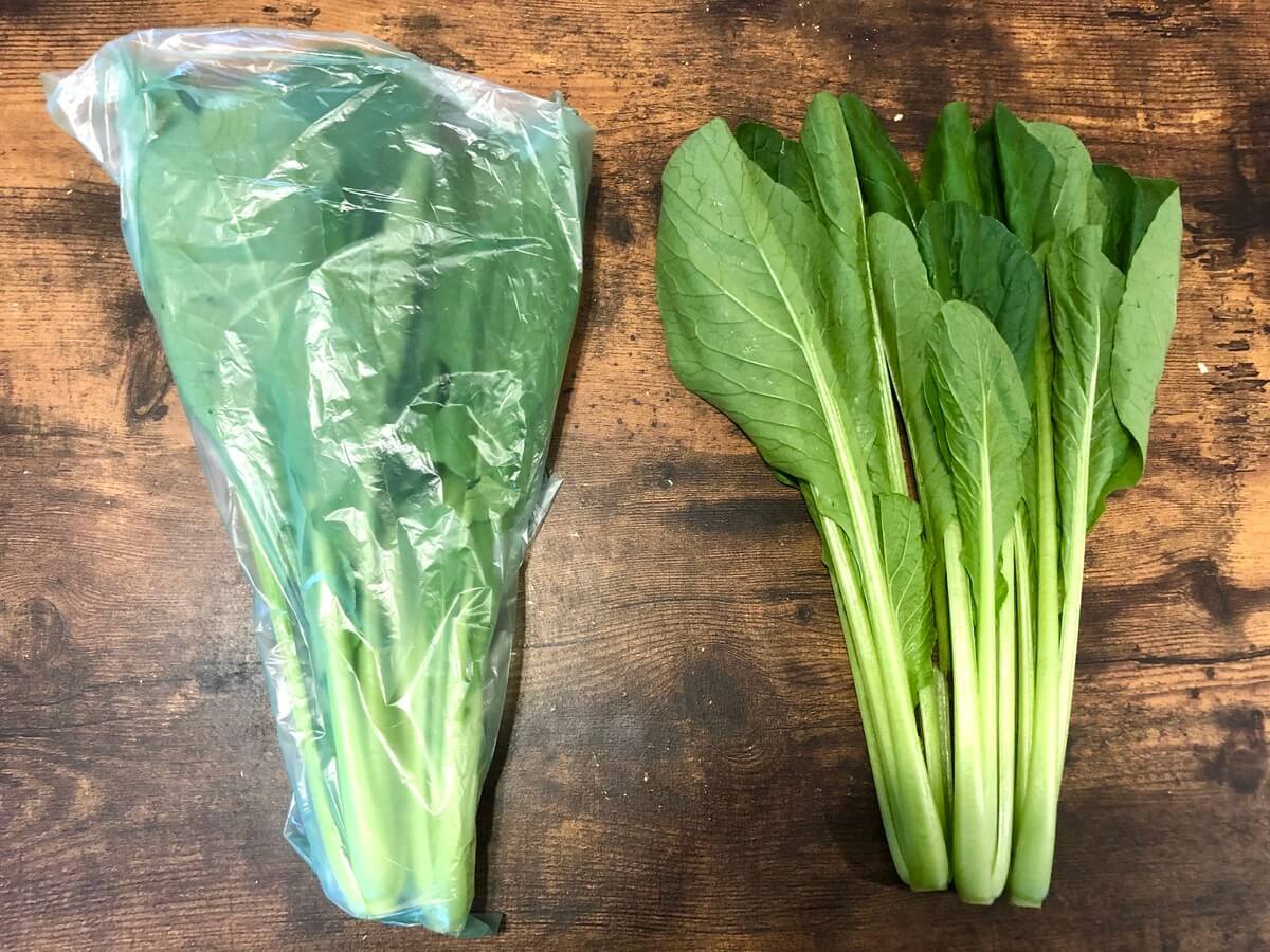 葉野菜の小松菜で実験です。半分に分けて、一方をダイソーの鮮度保持袋に、もう一方をもともと小松菜が入っていた袋に戻して冷蔵庫へ。