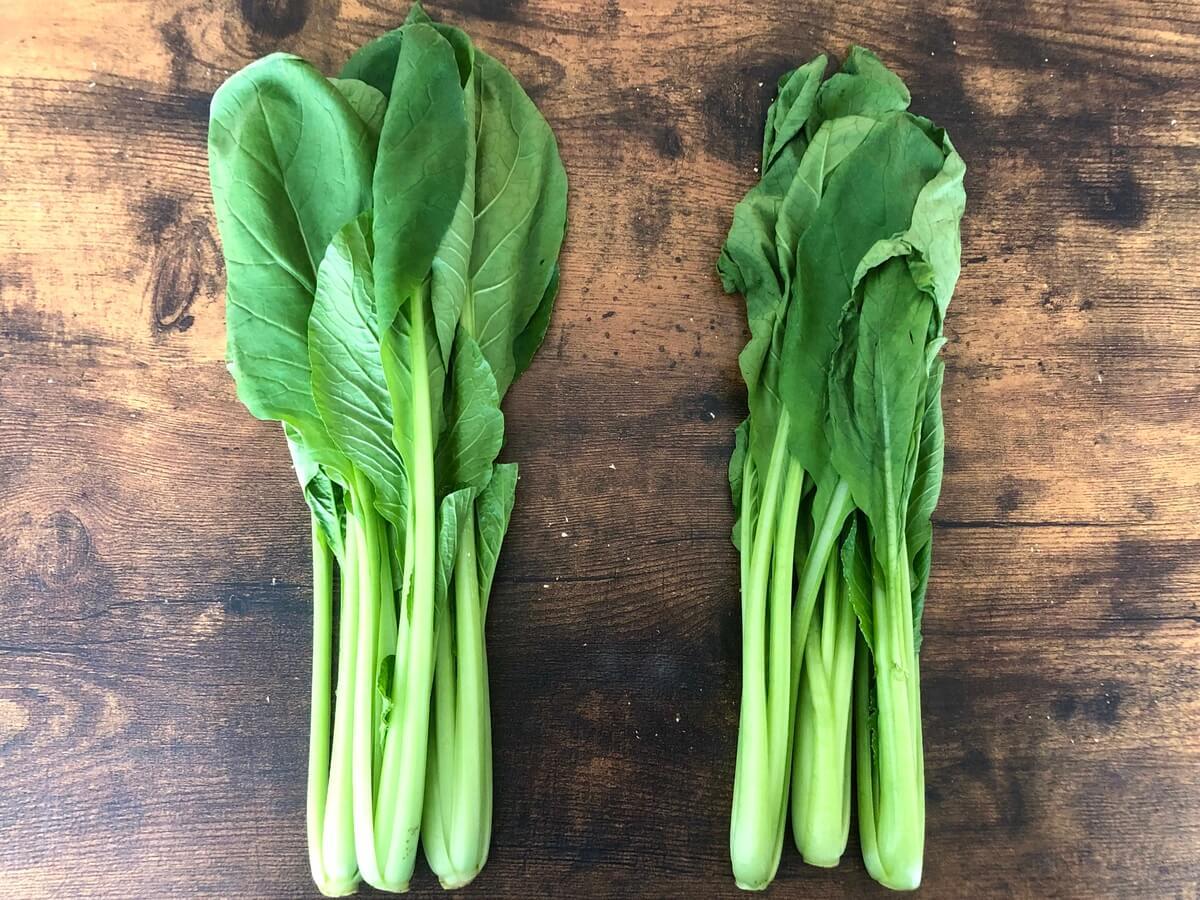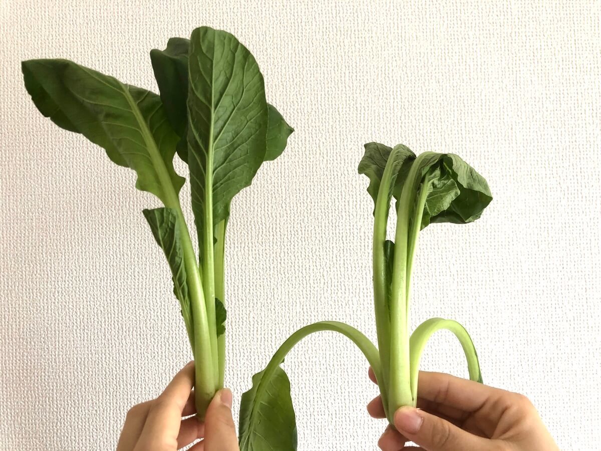結果は一目瞭然! 右の小松菜がしなっとしているのに対し、鮮度保持袋に入れて保存していた小松菜(左)はシャキッとしていてみずみずしさをキープしています。