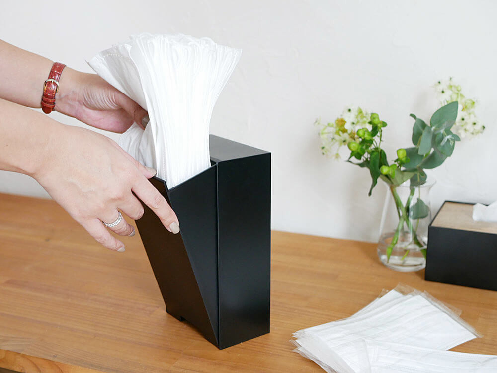 包装なしのマスクは下から引き出せて、個包装のマスクならフラップ口から取り出すことができます。