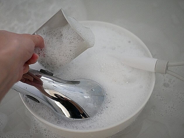 そして湯桶にオキシクリーン付属スプーンで2杯入れ、60度のお湯でしっかり溶かします。オキシクリーンはしっかり溶かすことで、洗浄力がUPするのです。