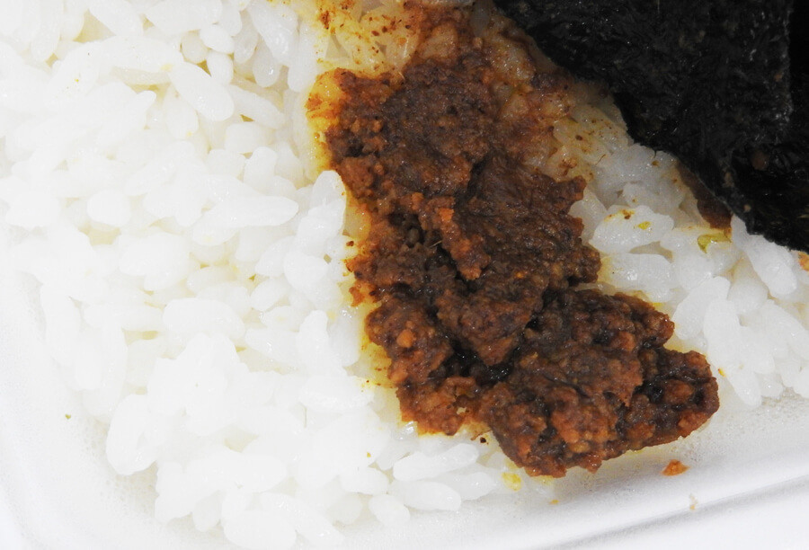 上で紹介している「シビ辛キーマカレーのり弁当」のキーマカレーと同じく、スパイシーではあるものの、わりとすぐに辛みが口の中から抜けていきます。