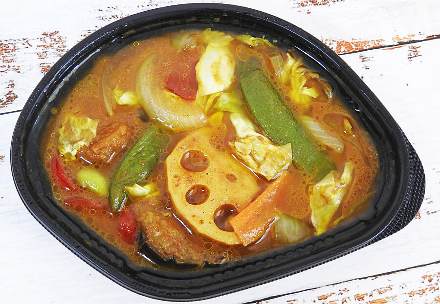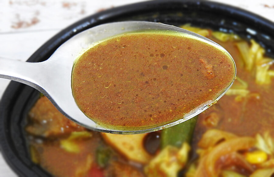 カレー容器のふたを取ってびっくりしたのが、野菜の多さ。「野菜たっぷり入っていますよ!」というのがウリのカレーであっても、実際に見ると「野菜の量が少ない……」と思う事もありますが、「野菜が摂れるスパイスカレー」は違いましたね。
