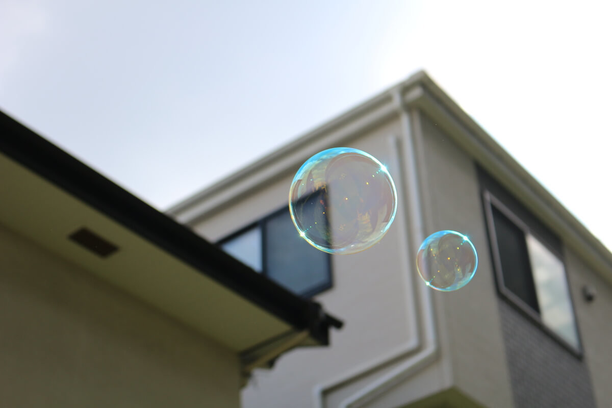 水鉄砲で遊ぶときは、しゃぼん玉を飛ばして水鉄砲でシューティングしてしゃぼん玉を割るゲームをしています。