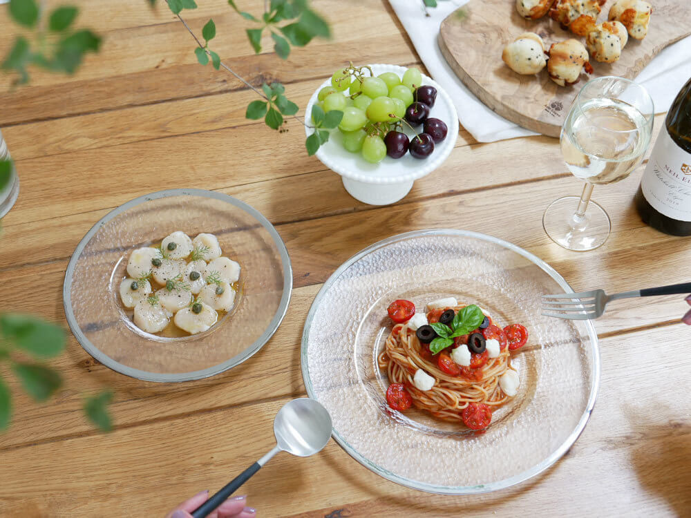 冷製パスタ・サラダ・お刺身・カルパッチョをガラスのお皿に盛り付けたところを想像……ちょっとひんやりしてきますよね♪