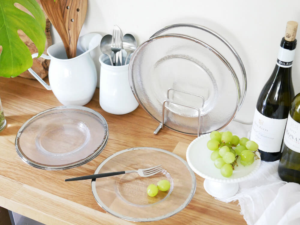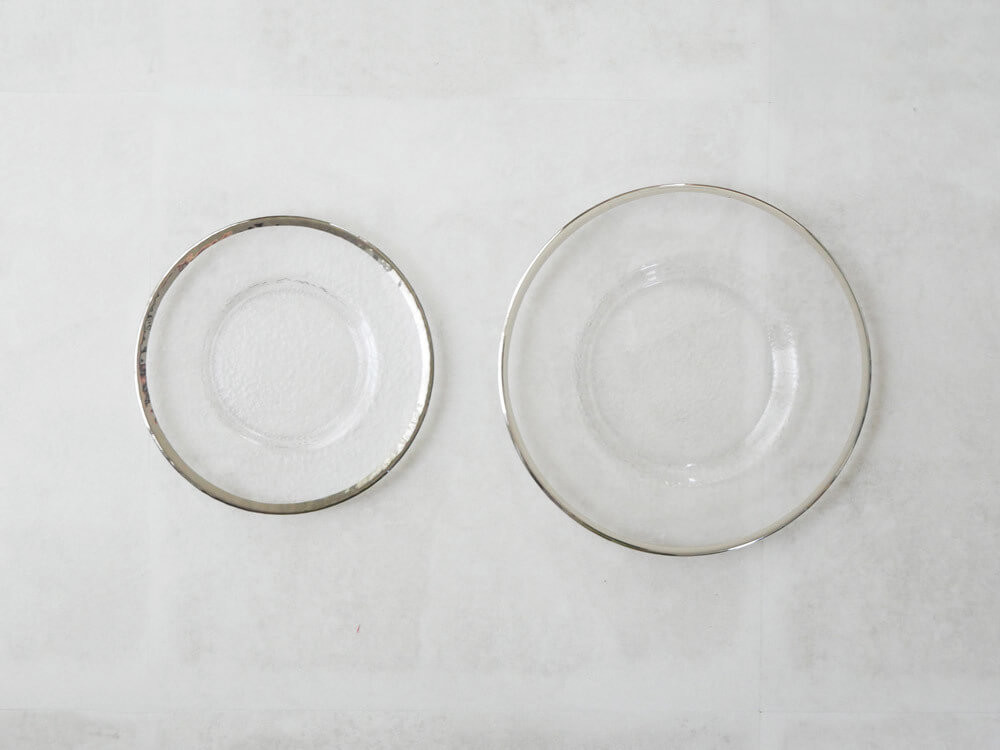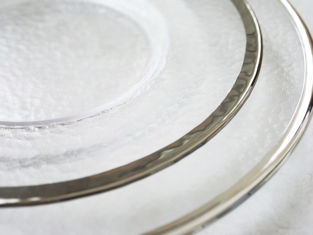 意味のある細かな凹凸感とシルバーの縁が美しい、透き通ったテーブルコーデでまずは夏の食卓を楽しんでみてはいかがでしょうか。