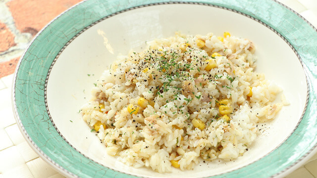 1.耐熱ボウルにごはん、コーン缶、油を切ったツナ缶を入れる。