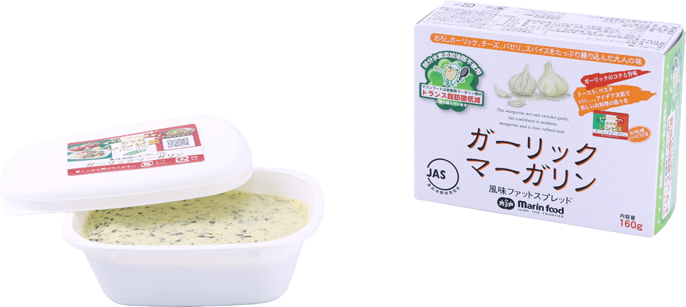 バター風味豊かなソフトタイプのスプレッドに、おろしガーリックをはじめナチュラルチーズやスパイスをバランスよくブレンドしたオリジナル商品です。