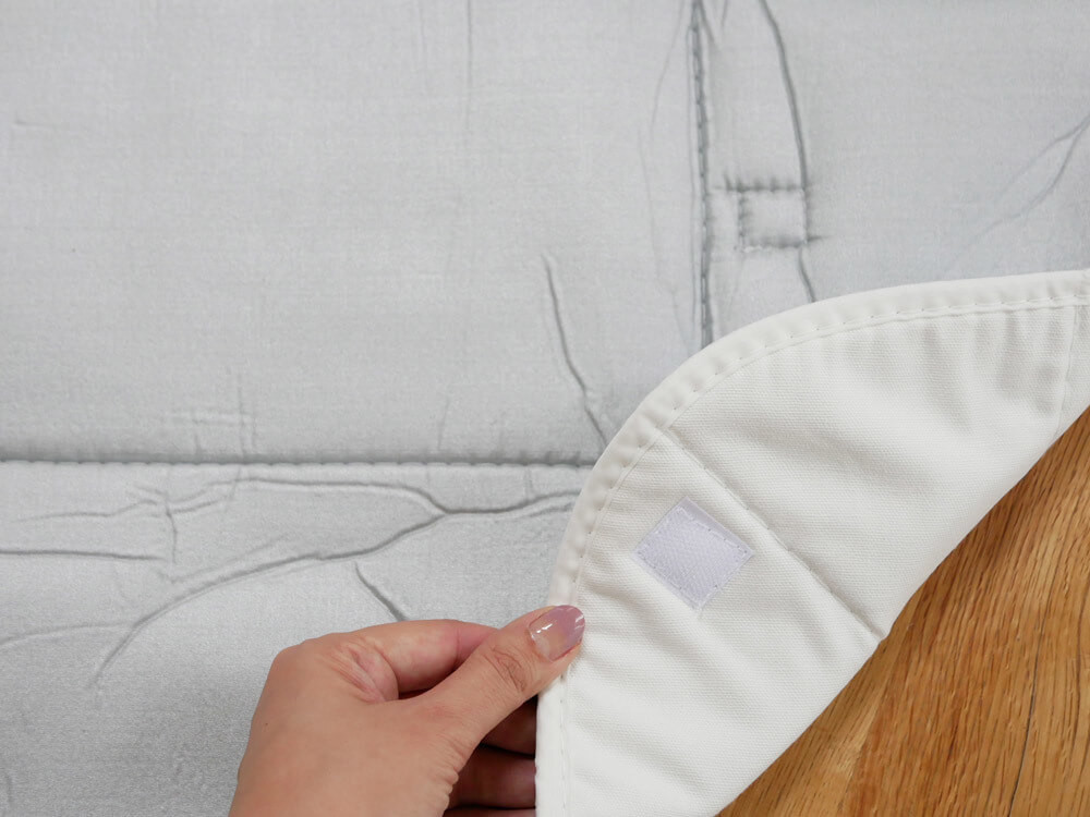 裏面も綿100%で中綿はポリエステル素材、クッション材には、ボンディング加工が施されたポリウレタン素材を使用しています。