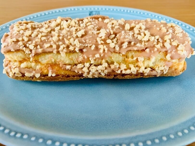 ぱっと見た感じ、「エクレアじゃないの?」と思いましたが、『サクッと食感のビスケット生地でふんわりとした生地を包んで揚げたドーナツ』だそうです。