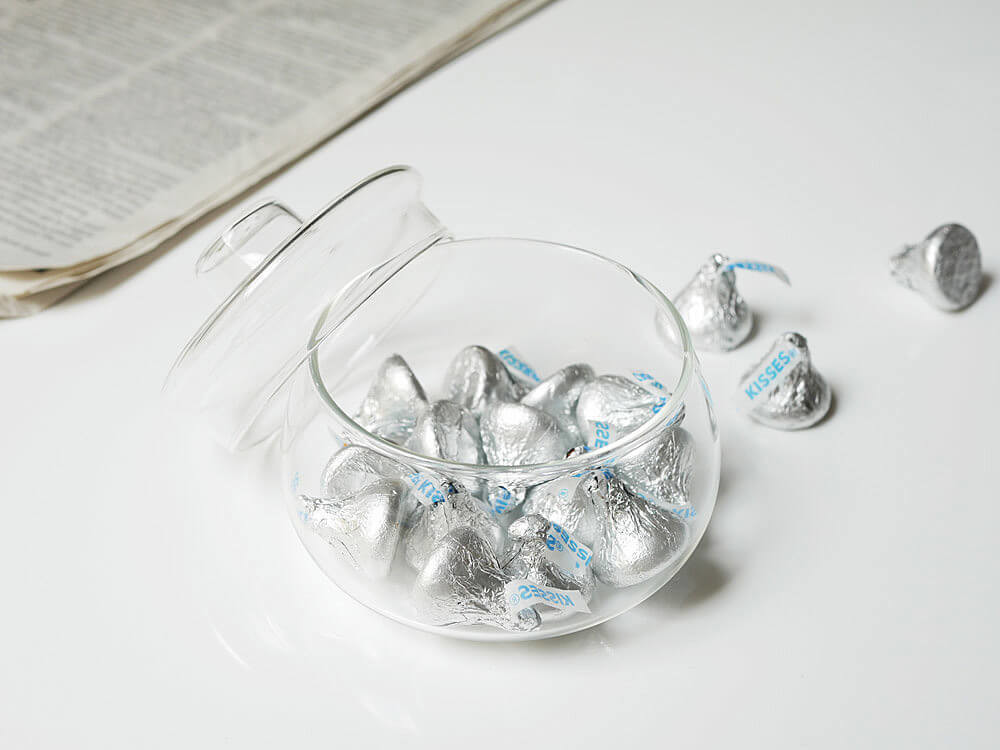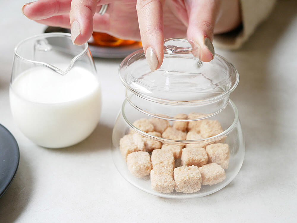 ガラス製で中身が見えるので、角砂糖を入れると可愛く映えるデザインです。