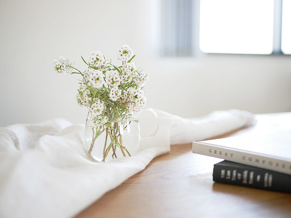 透明感のあるガラス製のピッチャーは、ちょっとした季節のお花を飾るのに最適。