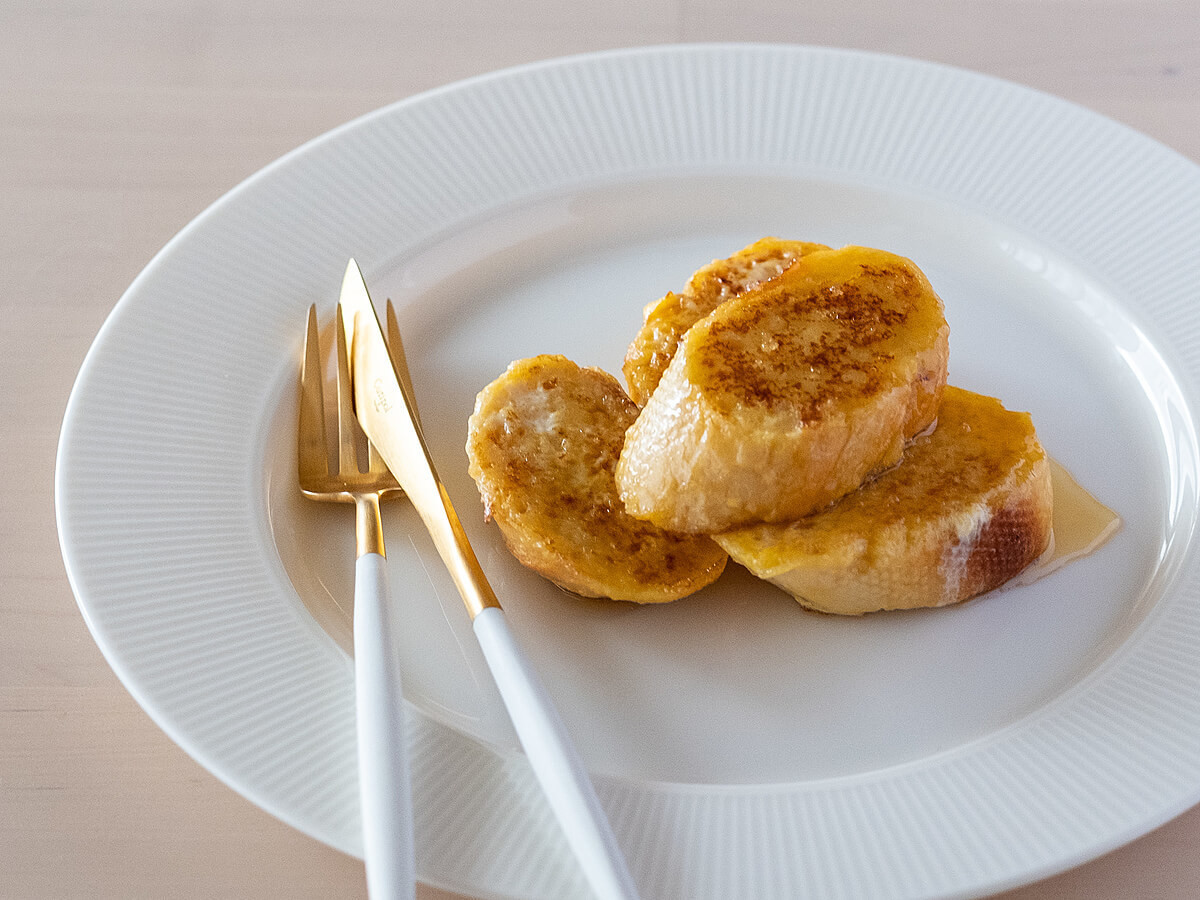 オーブンで焼いたメニセーズのプチパンをカットし、卵液につけてから焼けば、おいしいフレンチトーストが完成します。
