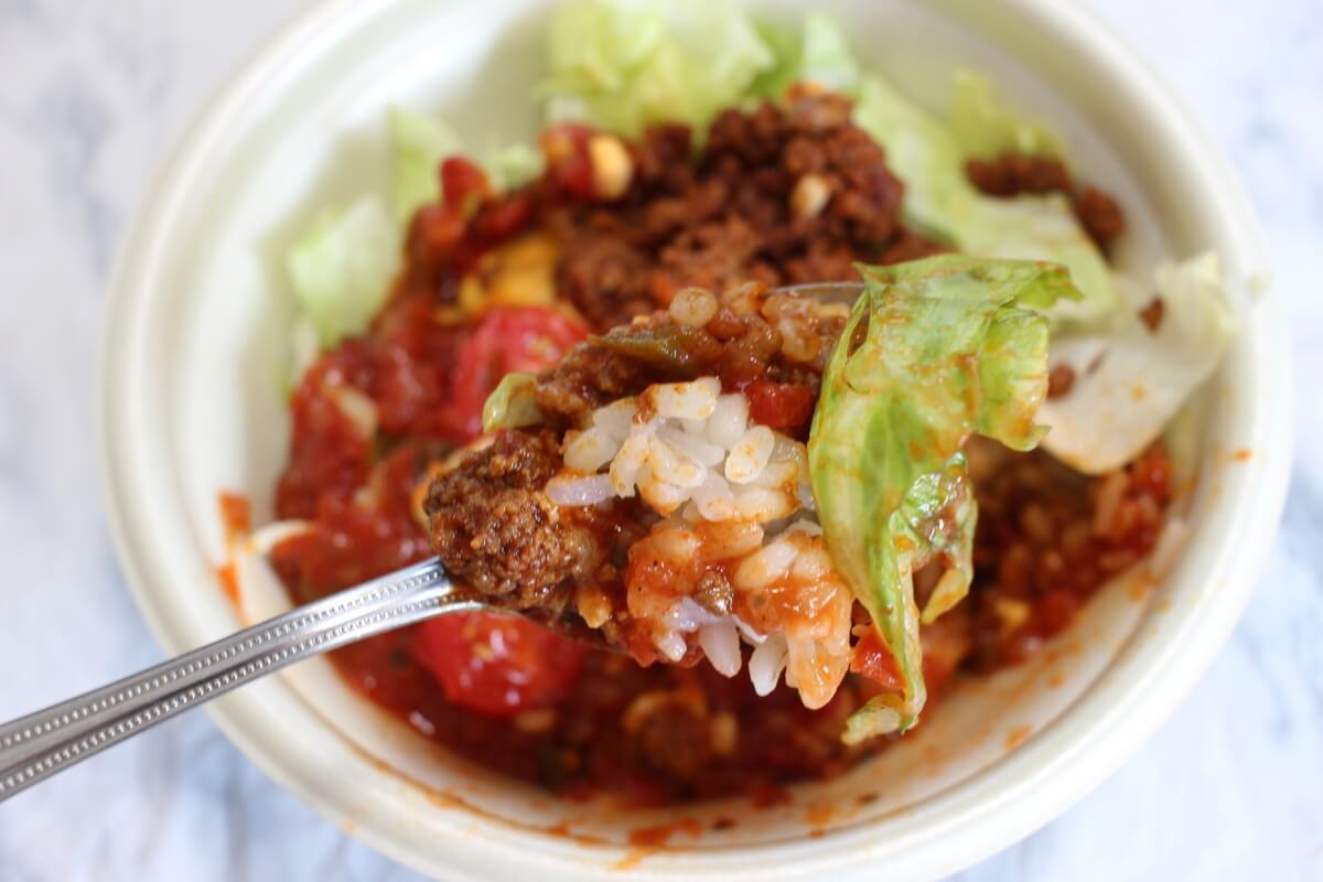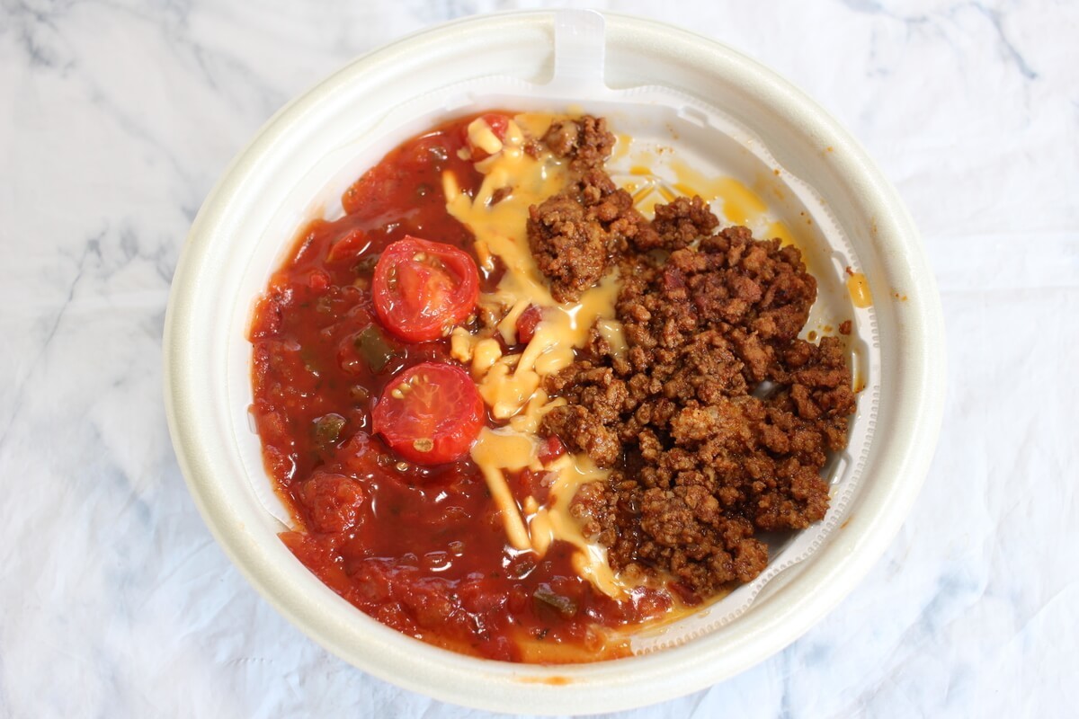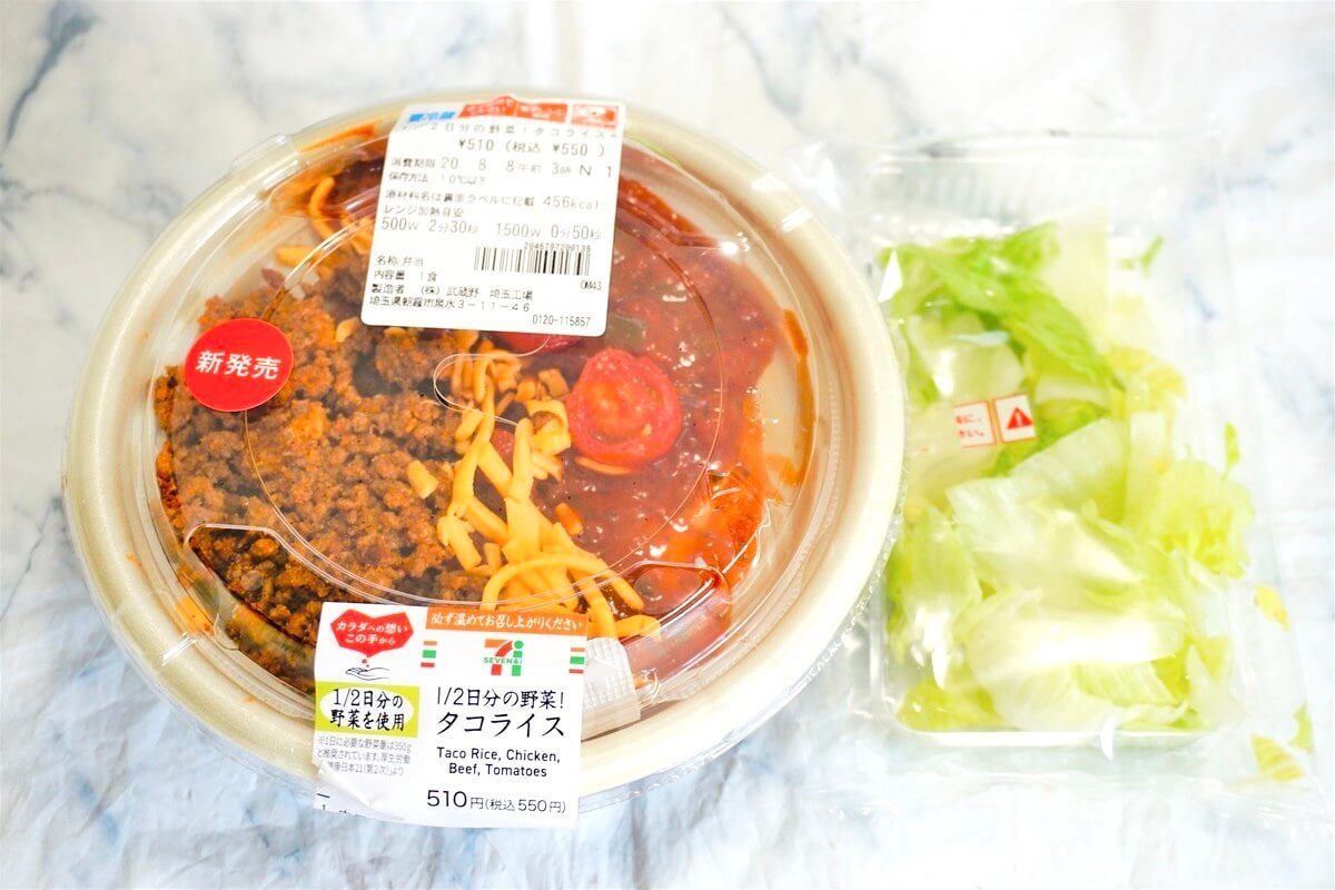 セブンイレブンへ行ってみると、見慣れない形状の「1/2日分の野菜!タコライスもち麦ご飯」を発見。