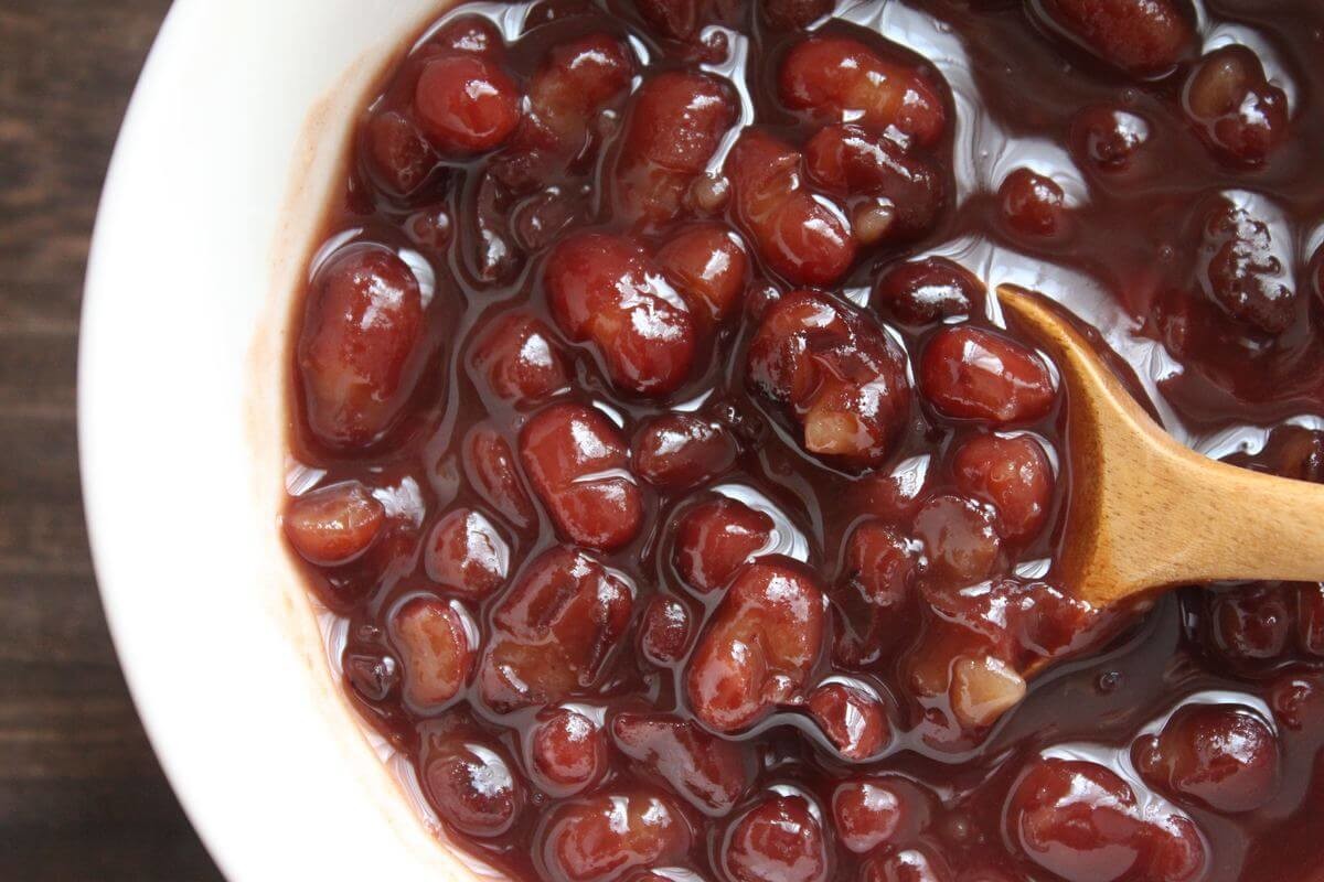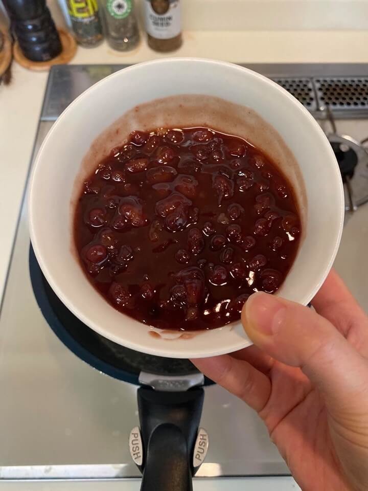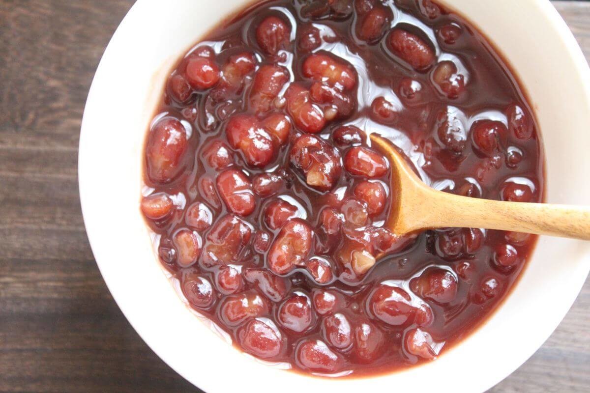 2、1が完全に溶けたら、ゆであずきを入れます。