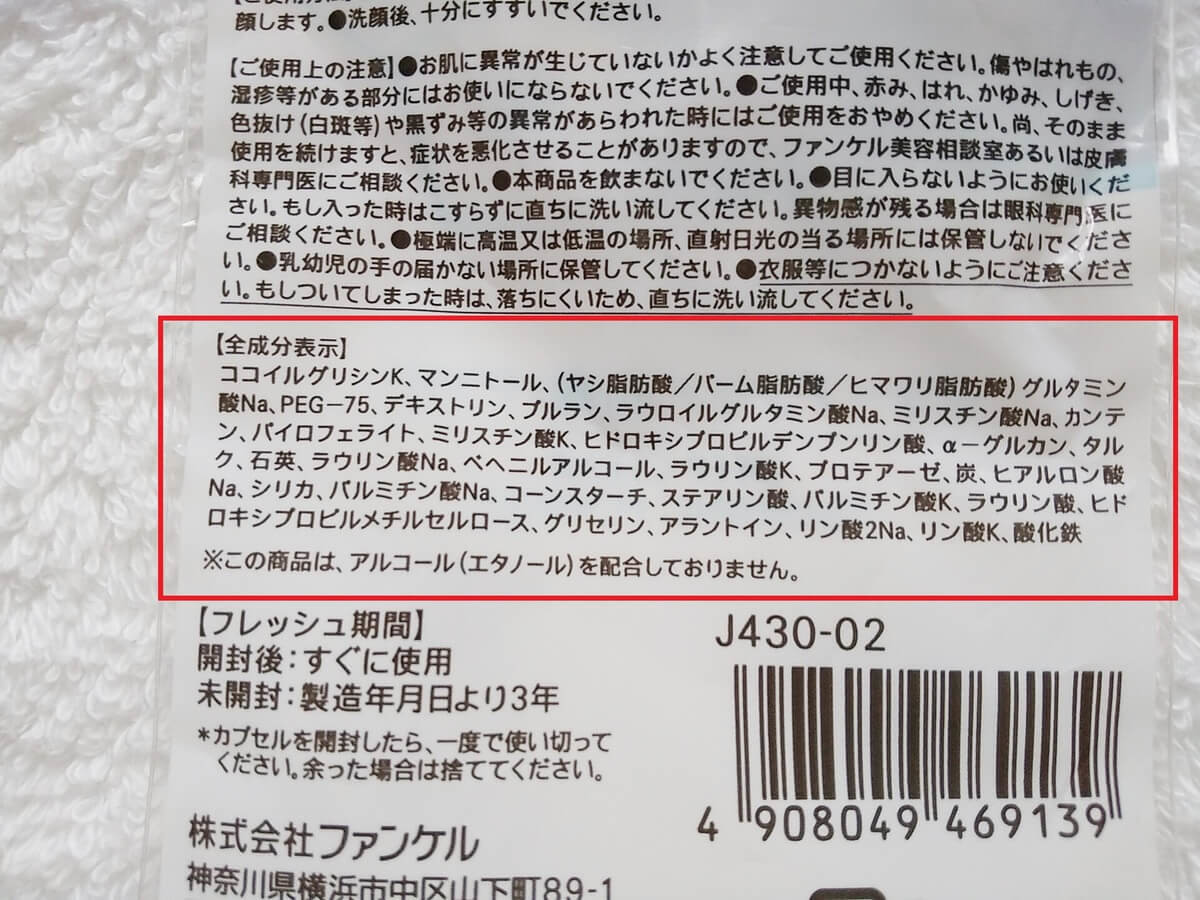 ファンケルで販売している通常版は30個入り1,980円(税込)と量が多めです。毎日使える商品ですが、私は週1回の頻度で使っているのでコンビニ版の10個入りがベスト。無理なく使いきれる量で助かっています。 商品の中身はどちらも同じものです。1個あたりの値段は通常版の方が安いので、まずはコンビニ版でお試しして、肌に合ったら通常版に切り替えるのも賢い方法だと思います。